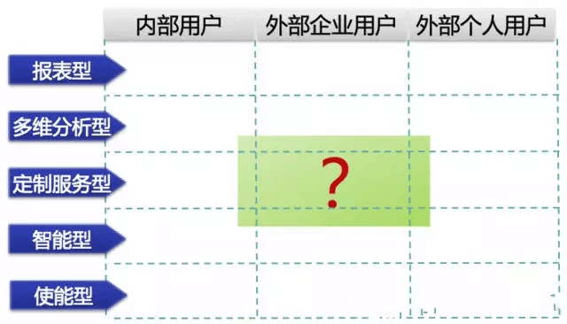 在狭义的范畴里,从使用用户来看,可以是企业内部用户,外部企业客户,外部个人客户等。从产品发展形态来看,从最初的报表型(如静态报表、DashBoard、即席查询),到多维分析型(OLAP等工具型数据产品),到定制服务型数据产品,再到智能型数据产品、使能型数据产品等。(如题图所示)。